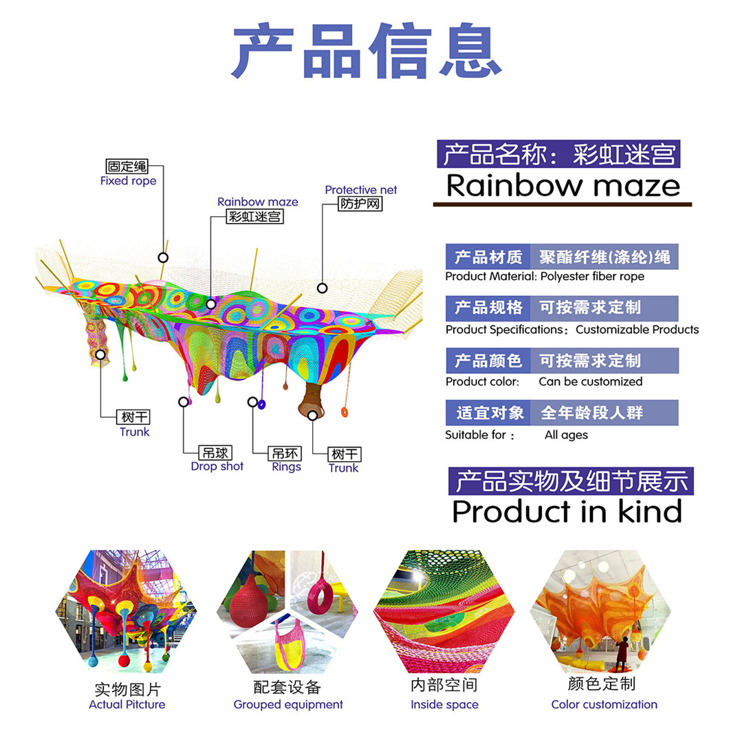 3,彩虹迷宮游樂(lè)設(shè)施具象的外觀,成為必不可少的打卡景點(diǎn),是繩網(wǎng)和游樂(lè)相結(jié)合的一種新型游樂(lè)設(shè)備,絕不只是視覺(jué)上的游戲,讓人感受表面的愉悅。設(shè)計(jì)的出發(fā)點(diǎn),就是要?jiǎng)?chuàng)造一個(gè)能讓孩子們沉浸其中的娛樂(lè)。