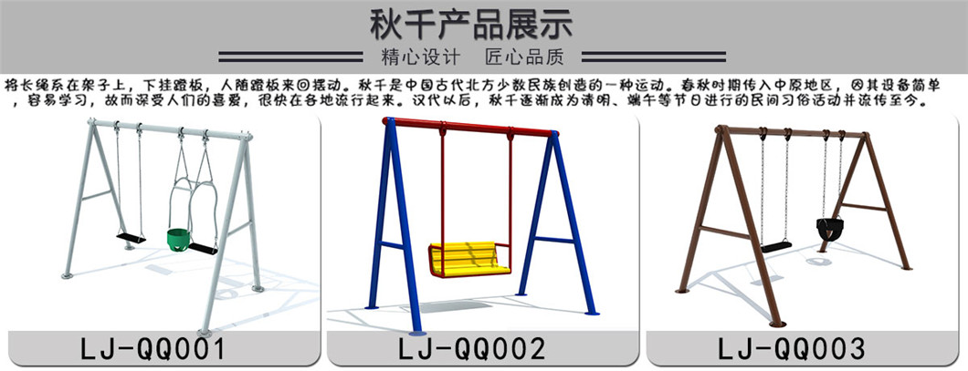 2,樂季公司的戶化外秋千是新推出的兒童樂園設(shè)備,可以在此同時容納多人游玩,一款游戲游藝設(shè)施新款戶外秋千是讓我們新推出的兒童樂園設(shè)備。由我司專業(yè)設(shè)計,全國上門安裝。真廠家,安全品質(zhì),雙向安全。