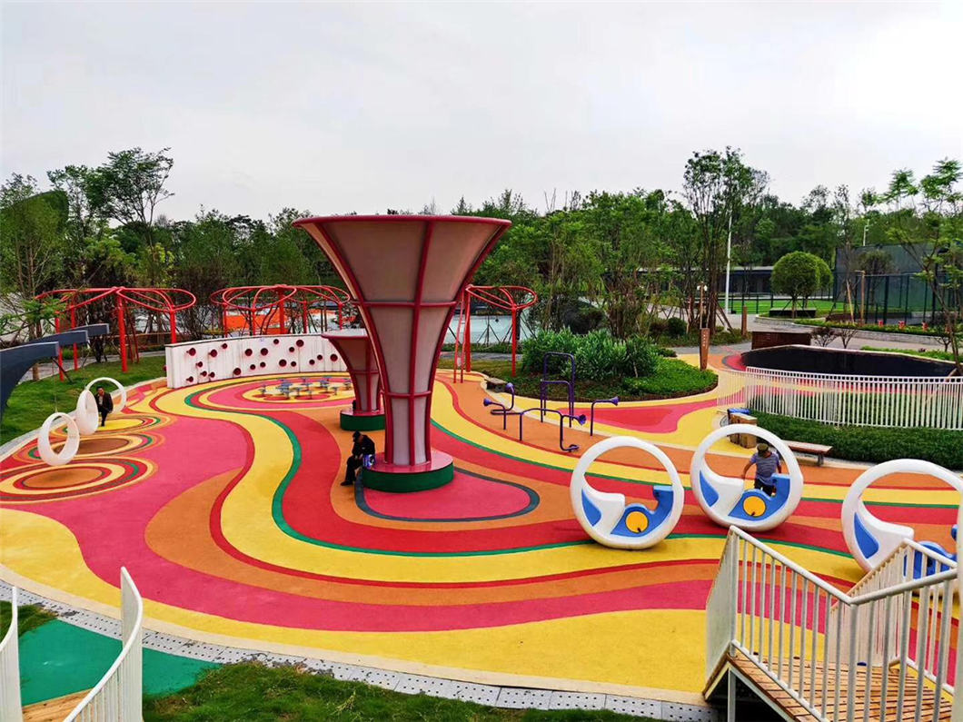 2、戶外兒童非標(biāo)游樂設(shè)施具有安全的環(huán)境,使用植物裝飾、進(jìn)口木材、石板等制成,符合EN1176及標(biāo)準(zhǔn),在設(shè)計(jì)方案中,地面材料為EPDM塑膠地面,通過各種顏色的地面圖案,以故事線的方式將場地各功能區(qū)串聯(lián)起來。