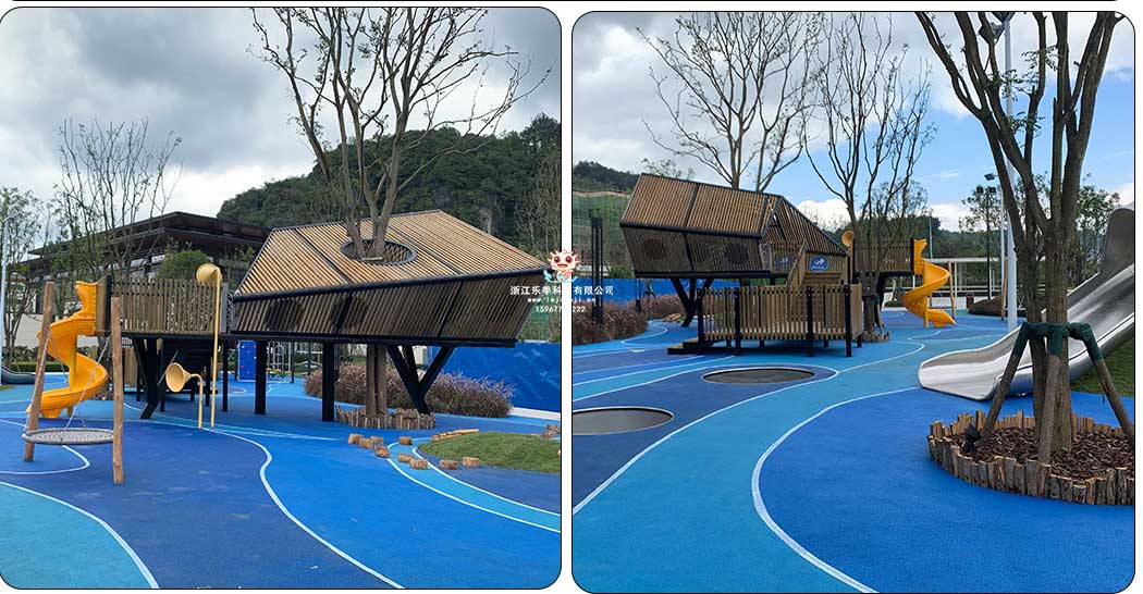 該項(xiàng)目設(shè)計以樹屋為主題,加入了蹦床,爬網(wǎng),鉆洞等多元素的戶外非標(biāo)游樂設(shè)備項(xiàng)目。